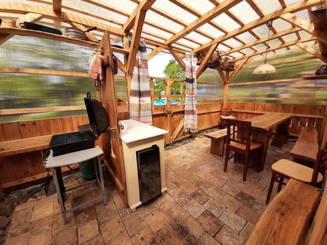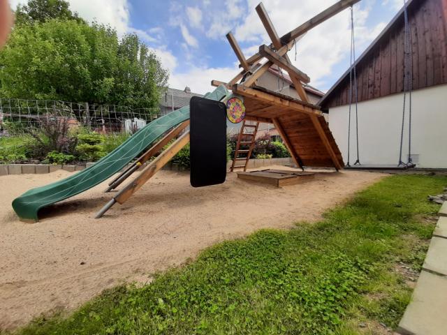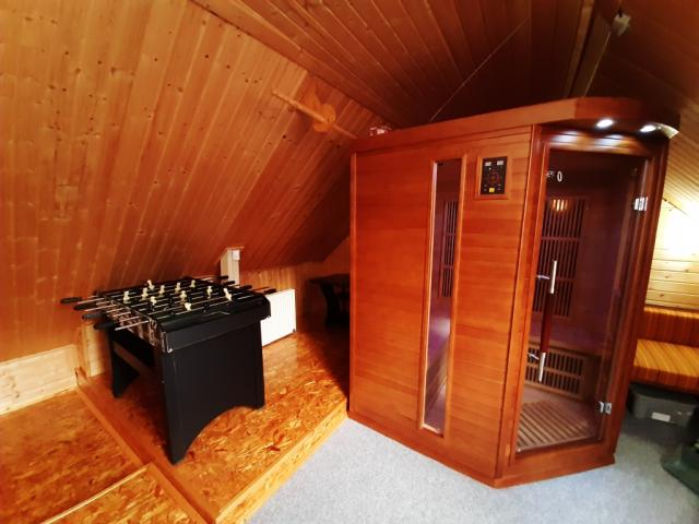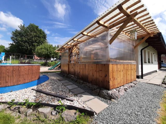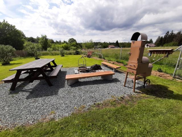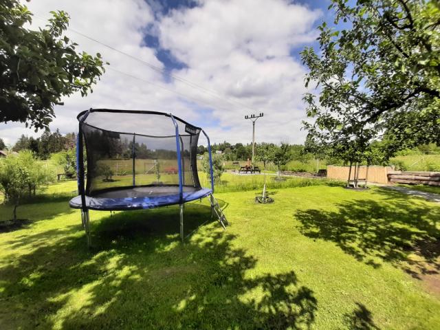 ohniště ano, zahradní nábytek dřevěný+kovový, houpačka dětská, sauna (infrasauna pro 4 os. v ceně pronájmu), pískoviště, badminton, petang, kachlová kamna (kuchyňský kout), gril plynový, udírna ano, posezení pod pergolou, skluzavka, trampolína, lehátka 4x, uzamykatelný prostor pro kola |
