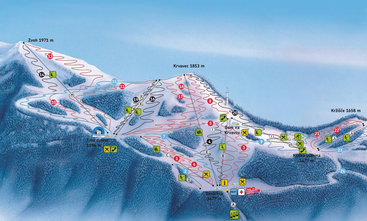 - z úhlu pohledu čistě sportovního pravděpodobně nejlepší slovinské lyžařské středisko vůbec#- 30 kilometrů širokých sjezdovek s výtečnými sněhovými podmínkami díky na Slovinsko vysoké nadmořské výšce#- nebývale rozsáhlý systém umělého zasněžování aneb 150 lyžařských dnů v roce zde spíše pravidlem než výjimkou#- ojediněle vyvážený poměr sjezdovek co do jejich náročnosti#- až nečekaně dlouhé černé téměř u každé lanovky, pestrý výběr převažujících červených i několik zajímavých modrých doplněných začátečnickými svahy#- adrenalinová výzva v podobě měřeného sjezdového úseku#- příjemně vysoké procento sedačkových lanovek oproti lyžařským vlekům#- od roku 2023 nová rychlá krytá a vyhřívaná 6sedačka Zvoh s přepravní kapacitou 2400 osob za hodinu#- jedna z nejlepších slovinských lyžařských škol založená bývalým reprezentantem Borisem Strelem#- opravdu speciální nabídka pro snowboardery v podobě skvěle vybaveného snowparku#- rozmanitá nabídka doplňkových aktivit pro nejmenší návštěvníky hned na několika místech skiareálu#- vysokohorský okruh pro běžkaře a rozsáhlé možnosti pro skialpinisty či milovníky sněžnic#- zpravidla slunečné počasí a poloha skýtající daleké rozhledy od Lublaně až k moři#- posezení s občerstvením nabízející četné "brunarice" rozeseté po okolních svazích#- celkově velmi příjemně uvolněná a pohodová atmosféra na svazích, jež přeplněností trpí opravdu jen velmi výjimečně#- kvalitní, ale jen lanovkou dostupné ubytovací kapacity s fantastickou lyžařskou polohou přímo u sjezdovek#- a konečně i příznivé ceny, oproti nedalekým italským střediskům zejména pak v hlavní lyžařské sezóně#- díky relativní neznámostí Krvavce za hranicemi Slovinska minimum zahraničních návštěvníků |