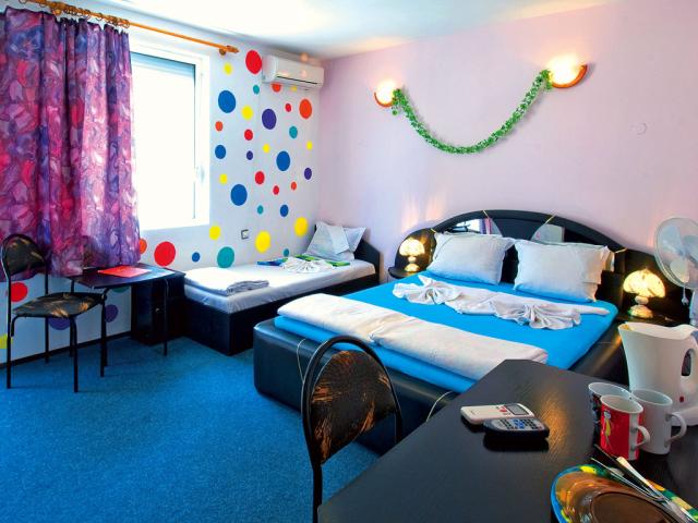 Pokoje s balkonem a sociálním zařízením (sprcha, WC) jsou klimatizovány (klimatizace zdarma) a vybaveny TV, chladničkou a varnou konvicí. Možnost jedné přistýlky. |