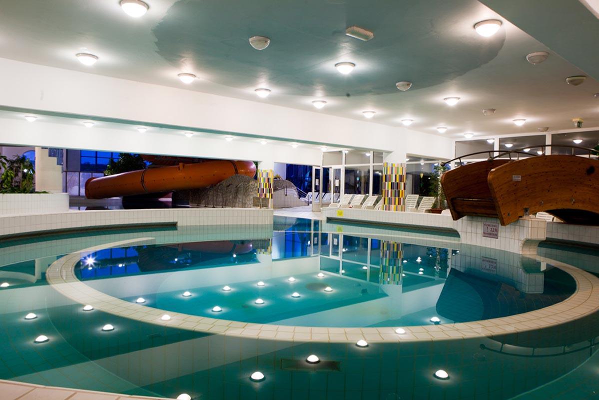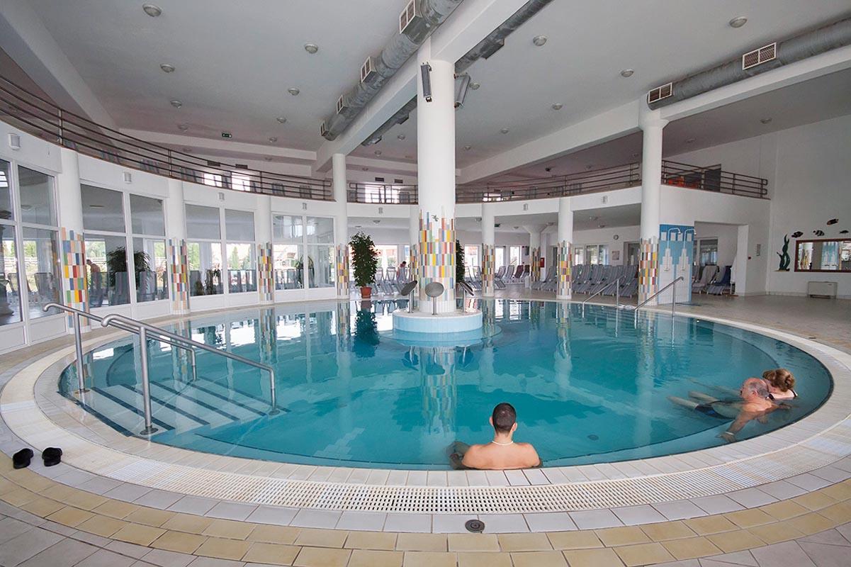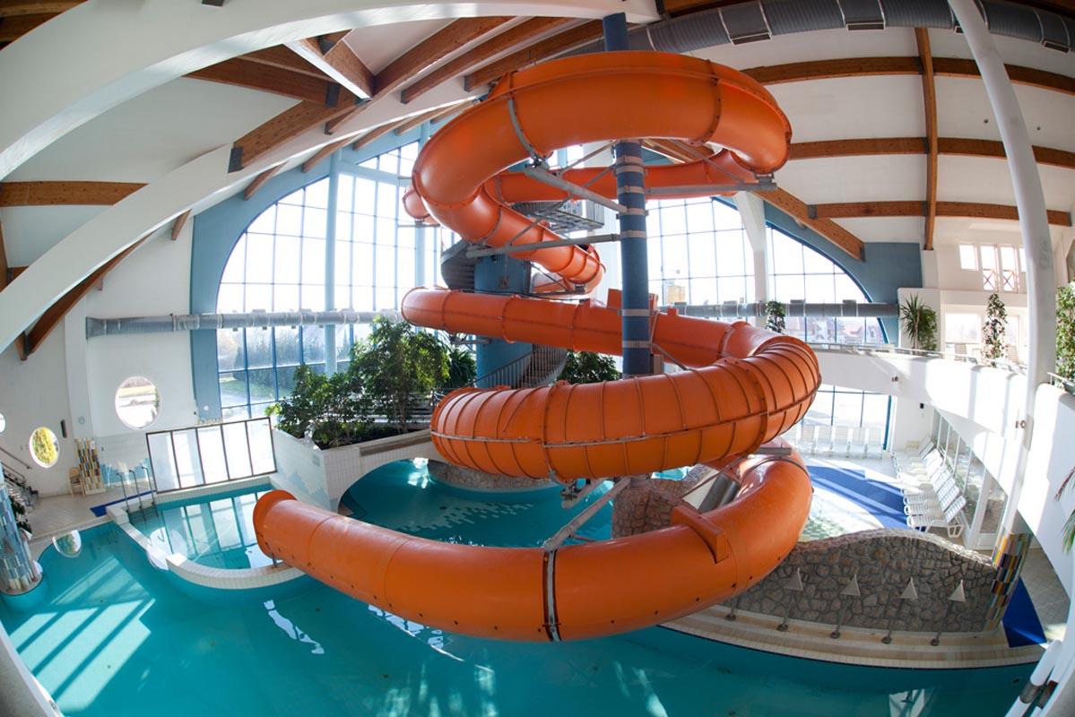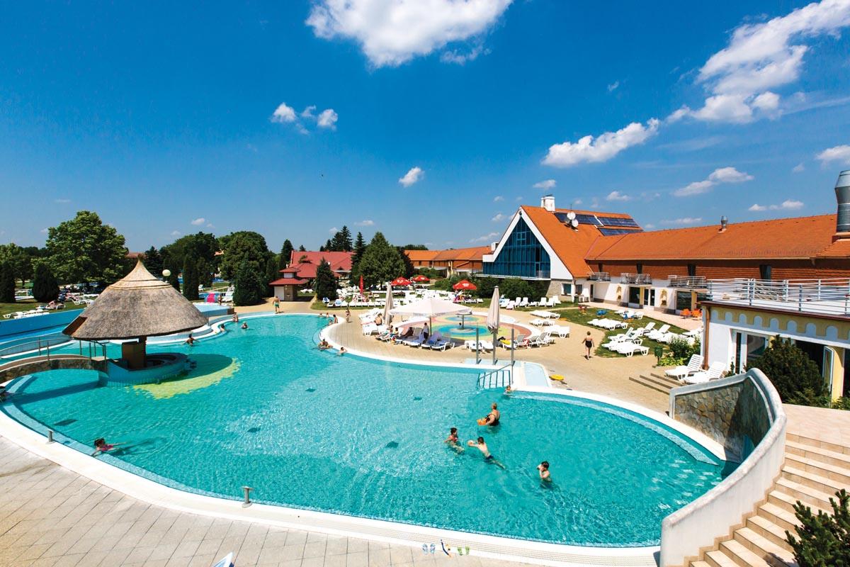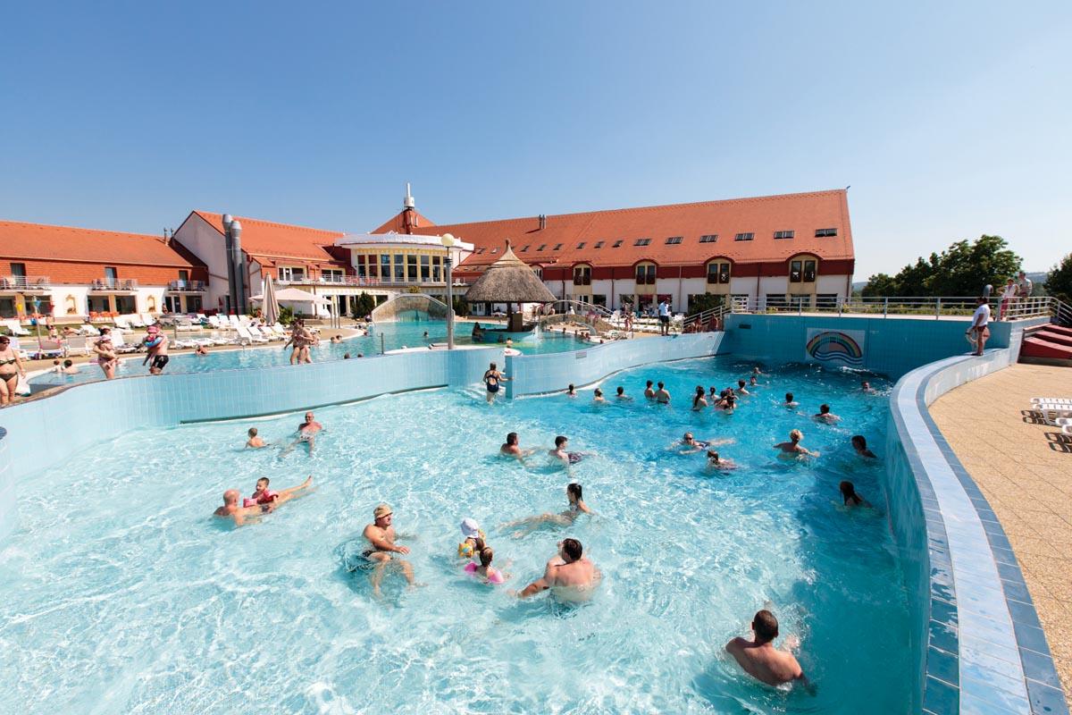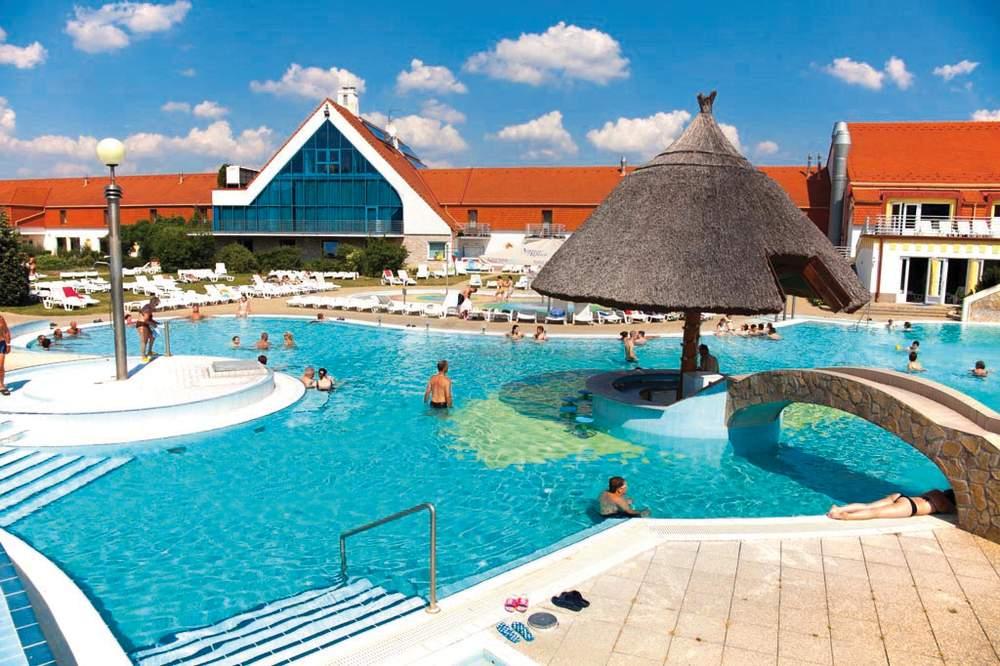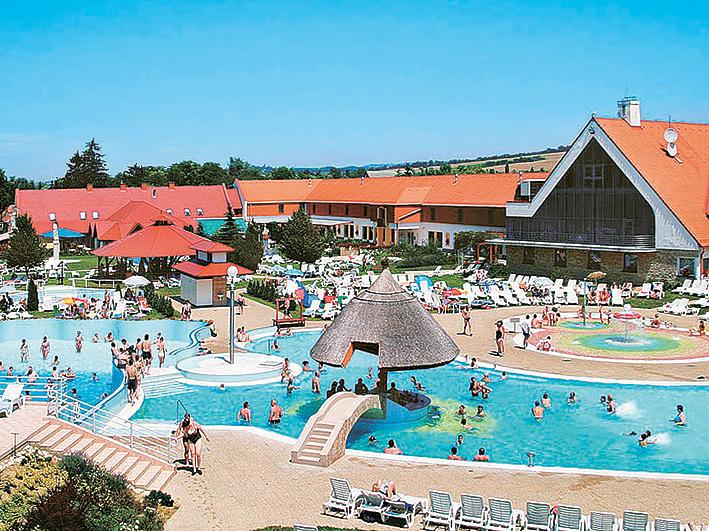 Lázeňský komplex Kehidakustány se nachází cca 13 km od Hévízu a 25 km od jezera Balaton. LÁZEŇSKÝ AREÁL Moderní lázeňský areál rozkládající se v parku o rozloze 3 ha s vodní plochou 2.600 m2 nabízí svým návštěvníkům 3 propojené části - léčebnou, zážitkovou část a saunový svět. Areál je vhodný pro návštěvníky všech věkových kategorií. Léčebná část: 2 vnitřní termální bazény s masážními tryskami (34-36°C) a pitná fontána. Zážitková část: venkovní termální bazén s vodními atrakcemi (30-34°C), venkovní termální bazén (34-36°C), venkovní termální sedací bazén zakrytý (34-36°C), bazén s vlnobitím (24°C), 2 plavecké bazény (22-32°C), obří skluzavky a dětský bazén (26-30°C). Vnitřní zážitkový bazén s masážními tryskami a lehátky (28-30°C), whirlpool (28-30°C), divoká řeka, 94 m dlouhý tobogán. Saunový svět: finská sauna, infrasauna, aromasauna, parní kabina, whirlpool s termální vodou, Kneippův chodník. |